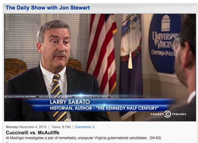 Priceless segment on the Daily Show about the gubernatorial race between Cuccinelli and Mcauliffe, featuring our own Larry Sabato and folks on the DTM. Sabato calls the two candidates “some of the worst I’ve ever seen,” and reveals that one voter he talked to compared them to a choice between “cancer and a heart attack.” Daily Show correspondent Al Madrigal then prepared two horrible Cuccinelli and Mcauliffe drinks and offered them to people on the DTM. “Which one would you like to drink for the next fours years?” he asked. Gagging ensued. Then he deducted that the choice was like a choice between “pond scum” and “dog poop.” Oh, priceless, check out the little kid at the end.
