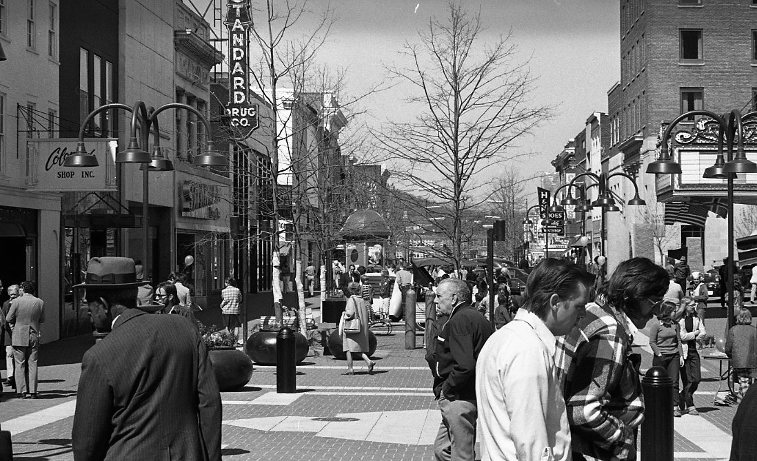 This photograph by Ed Roseberry shows the DTM in the early years of the brick-paved pedestrian mall. The willow oak trees are just getting established and some of the signage that hung along Main Street (dating to the 1950s and earlier) can still be seen here. Roseberry has documented downtown Charlottesville and UVA through his photography since the 1940s. Last year, DTM’s Dave McNair did this extensive piece on Roseberry for The Hook: [ http://www.readthehook.com/109735/ed ] Mr. Roseberry will be C’ville Images’ guest for slideshow presentations over the next couple of months. Check the website (www.cvileimages.com) for details. Vintage DTM is produced by C’ville Images.