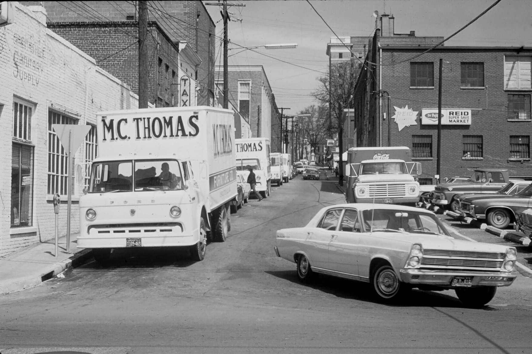 This view of downtown Charlottesville is looking north on 5th Street East from Water Street. The photograph was taken in 1972 before the construction of the Downtown Mall. Main Street at that time had a major furniture store (M.C.Thomas) and also a full-service grocery store (Reid’s) that faced East Main Street in the 500 block and had its own parking garage underneath. Tragically, Reid’s Supermarket would later burn down, but the business still continues today on Preston Avenue. Also seen in this photo in the distance is the Monticello Hotel and part of the Albemarle County Court House on Court Square. More vintage photos at www.cvilleimages.com