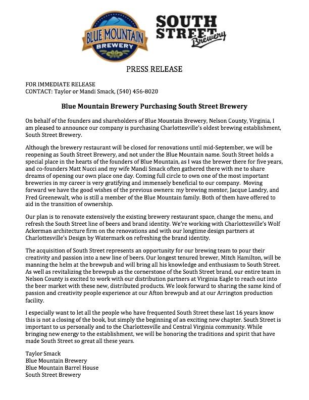 Back in the late 1990s, a young graduate of Hampden-Sydney College became my office-mate at a doomed Internet-start-up called Value America. It was his first real job out of college, and he hated it. We shared an office the size of a broom closet with no windows, and created and cranked out stupid ads for laptops and Weber grills that ran in USAToday and the The Wall Street Journal. We had greedy hopes that our stock options would be worth something one day. Alas, Value America went down in flames. One Christmas, though, young Taylor Smack received a home beer-brewing kit. The rest, of course, is local history. Now, Smack and his partners have purchased South Street Brewery on the DTM, where Smack actually worked for five years as he was hatching his beer-making plans. Below, you’ll find a release from Smack – who was always a fine writer, by the way – that’ll give you some details about his plans for the place. This, my friends, is a welcome development for the DTM. – David McNair