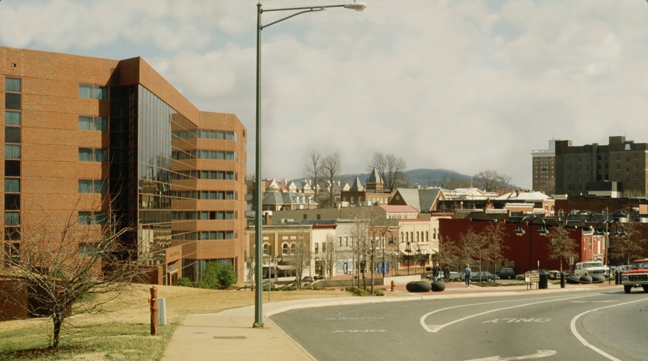 This view of the west entrance to the Downtown Mall was taken in the 1980s from the top of what historically is known as “Vinegar Hill”. This is after the Omni Hotel was constructed (1984) but well before the ice park. The paved street seen here is Water Street but Main Street once ran down Vinegar Hill in the center of this view. More vintage photos of Charlottesville at www.cvilleimages.com (photo from the Preston Coiner Collection at C’ville Images)