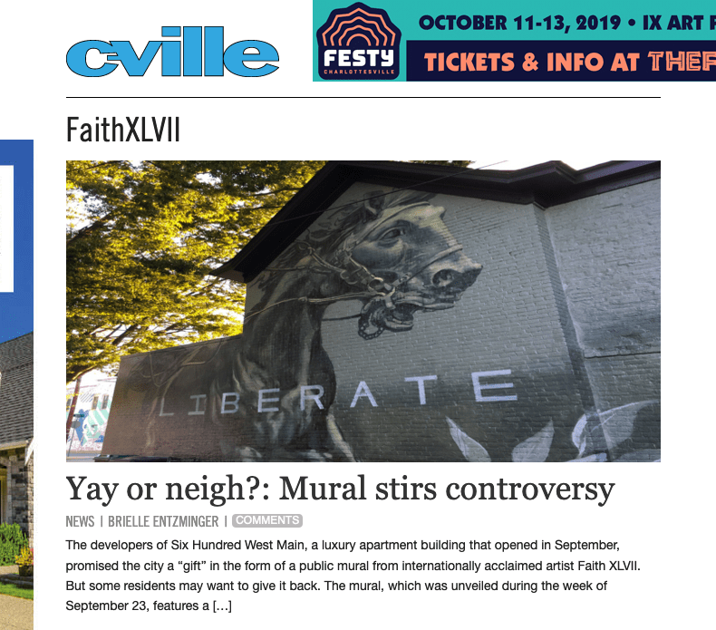 We make it about confederate statues, race, and gentrification of course! And C-Ville Weekly runs a story about it called “Yay or neigh?: Mural stirs controversy.” Link: https://www.c-ville.com/yay-or-neigh-mural-stirs-controver…/