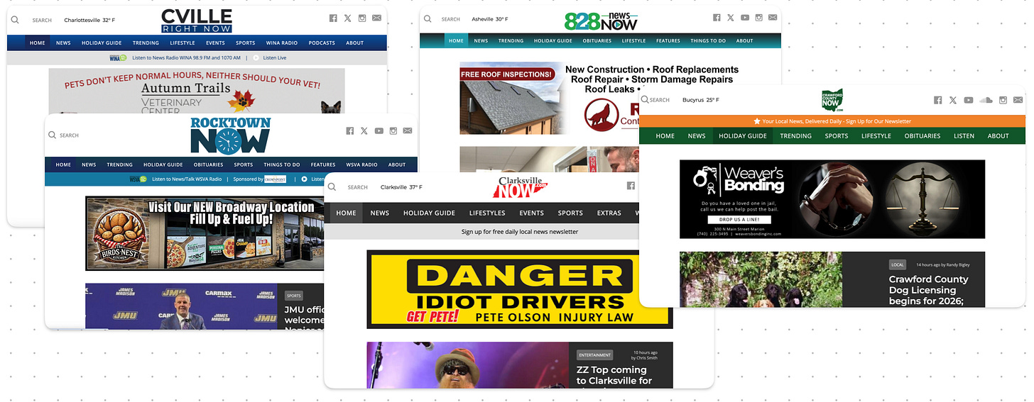Saga Communications, which owns Cville Right Now, seems pretty excited, too. Last year, the publicly traded media company, which owns local radio stations in 28 markets across the country, including the Charlottesville Media Group collection of radio stations (1070 WINA, 106.1 The Corner, Z95.1, 97.5 3WV, Fox Sports 102.9 FM, C-Ville Country), decided to launch branded local news websites in its markets. Cville Right Now, Rocktown Now, 828News Now, Crawford County Now, Clarksville Now, etc., all share the same website design and follow the same format.