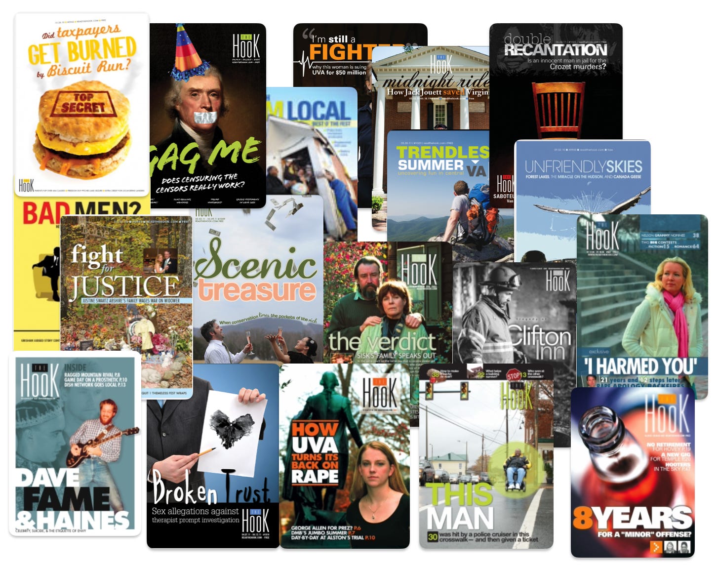 Going through the archives I was struck by what we’ve lost in terms of local news coverage. Week after week, the Hook delivered issues packed with local news, often featuring excellent long-form investigative reporting, and provided dynamic arts, music, food, and development coverage. Every cover was a work of art. Headlines were clever. It was funny, too. And tenacious, fearless. Issues of importance were given continuous, in-depth coverage. Boy, did the Hook know how to dig into an issue.